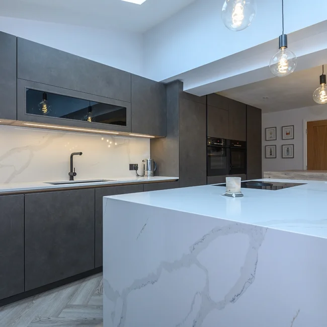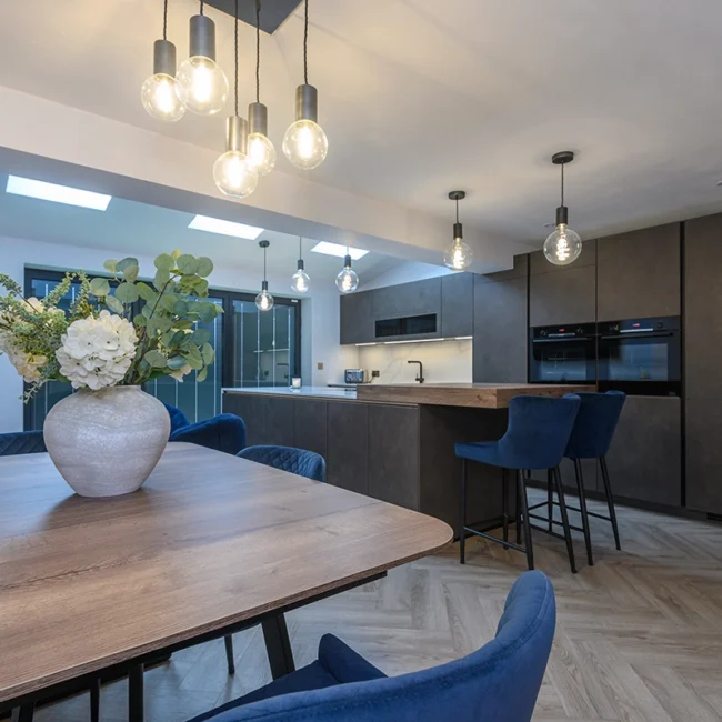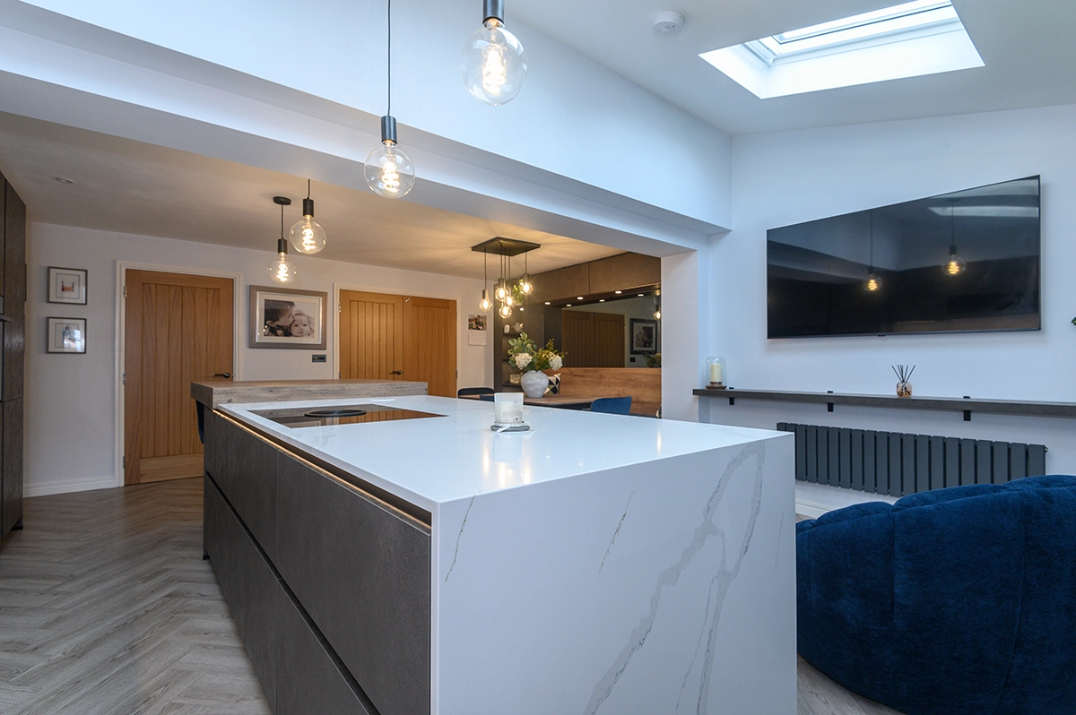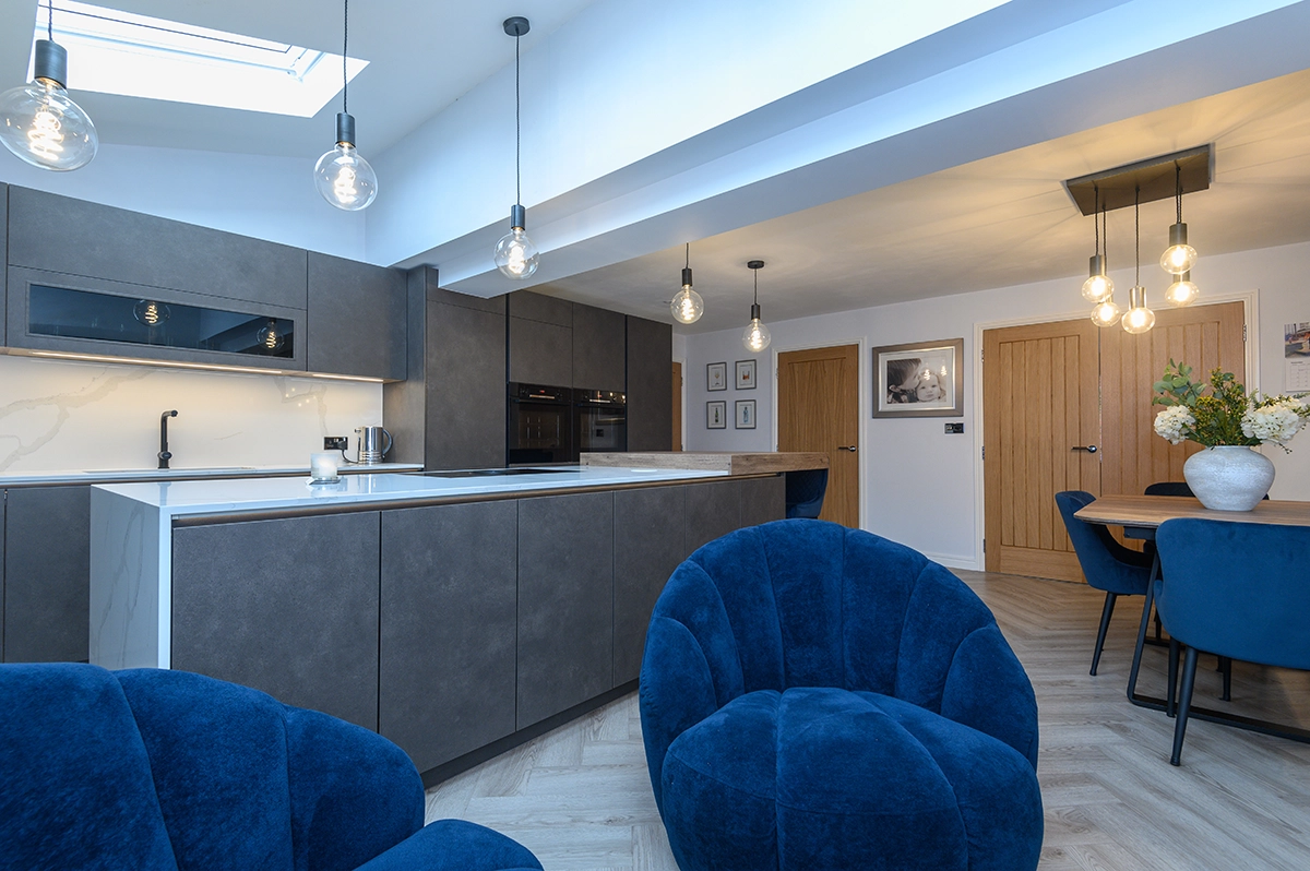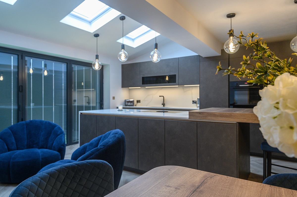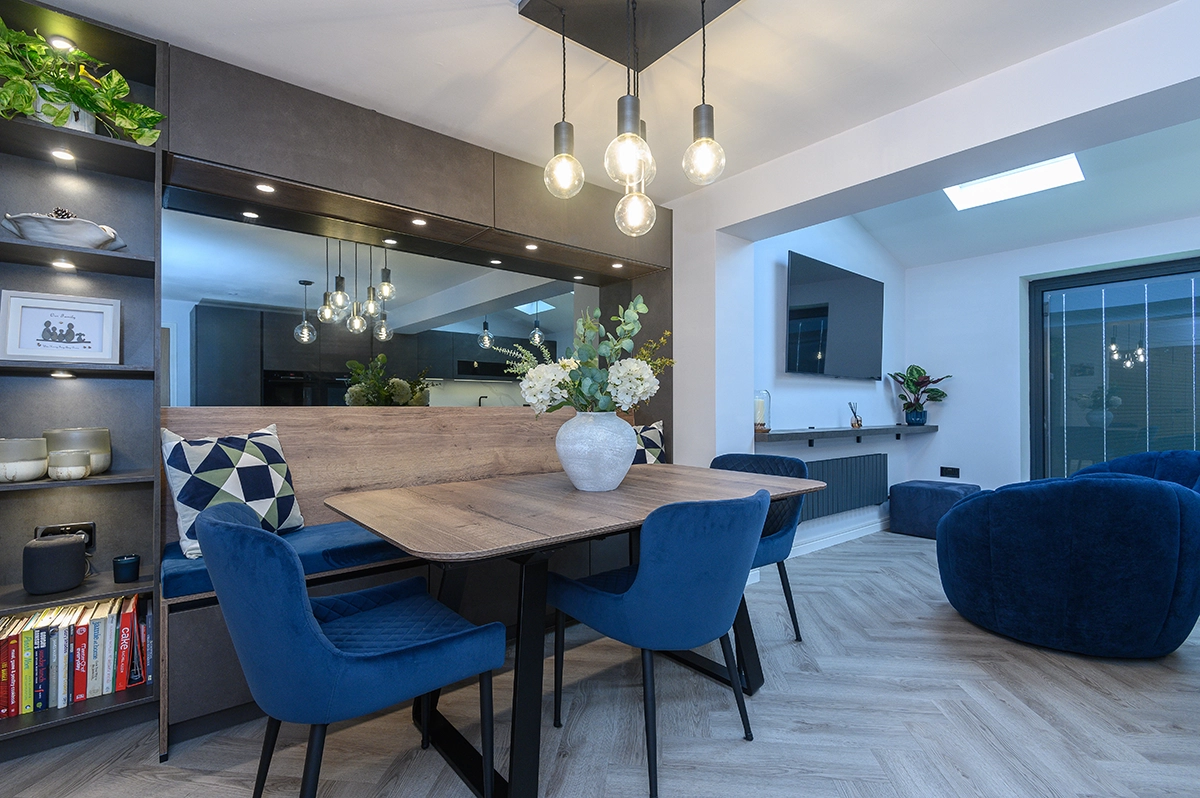 Creating different zones that work independently but visually, together as one design, can be challenging! But by giving each area it’s own ‘identity’, from the clean lines of the kitchen furniture to the luxe dining nook and cosy space to snuggle-up and watch TV, it works both practically and aesthetically.